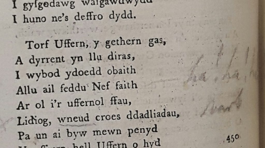 “ha! ha!” sgribla’r athrylith llenyddol Iolo Morgannwg (1747 – 1826) yn ymylon y llyfr hwn o farddoniaeth.