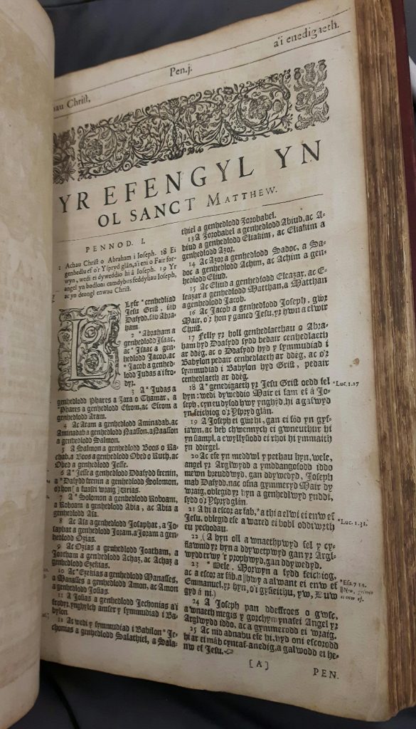 Tudalen gyntaf y Testament Newydd ym Meibl Cymraeg 1620 Casgliad Salisbury.